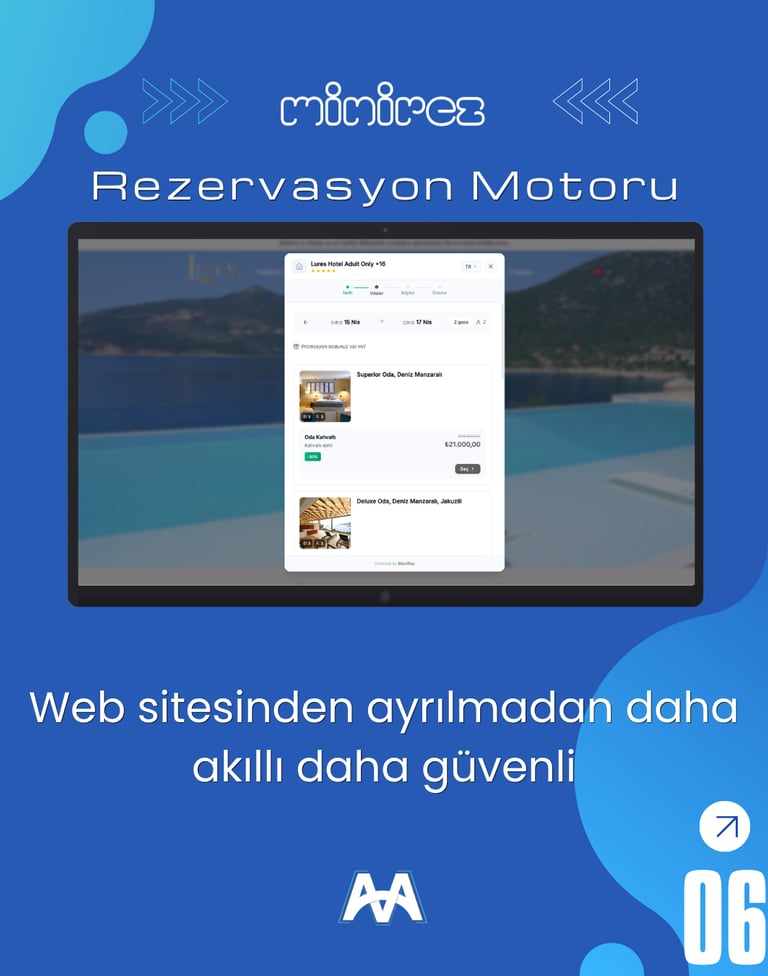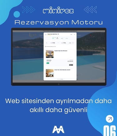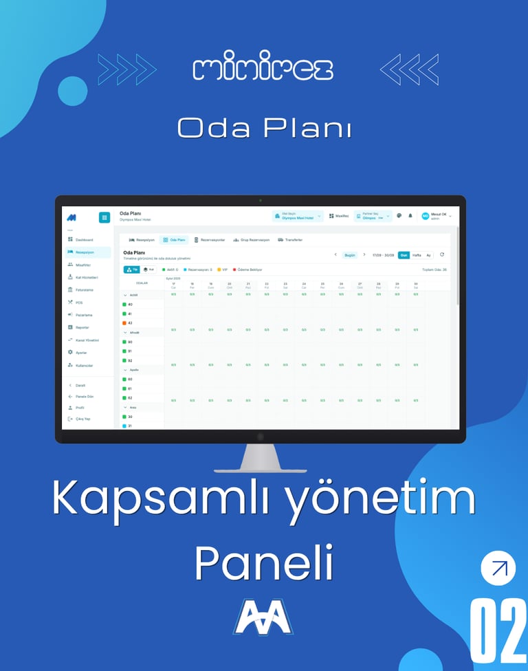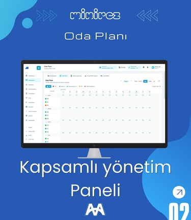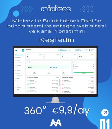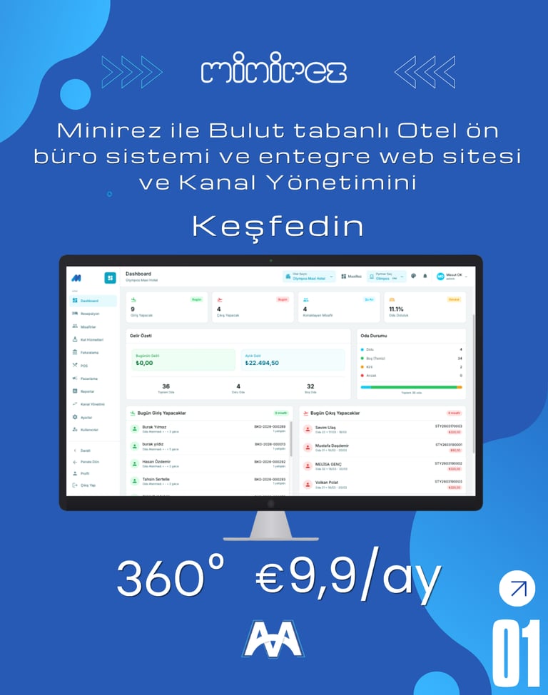 Minirez web tabanlı otel yönetim sistemi, ön büro modülü ile tüm operasyonlarınızı tek merkezden kontrol etmenizi sağlar. Rezervasyon, resepsiyon, housekeeping, fatura ve folyo işlemlerinin yanı sıra channel manager, online rezervasyon ve emniyet kimlik bildirim süreçlerini hızlı ve sorunsuz şekilde yönetebilirsiniz. Gelişmiş raporlama altyapısı sayesinde tüm operasyonel verilerinize tek tıkla ulaşarak otelinizi daha verimli yönetebilirsiniz.