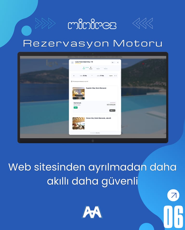 Online rezervasyon sayfanız, markanızın dijital vitrini olur. Tüm misafir verileri sizin CRM sisteminizde toplanır, üçüncü taraflarla paylaşılmaz.